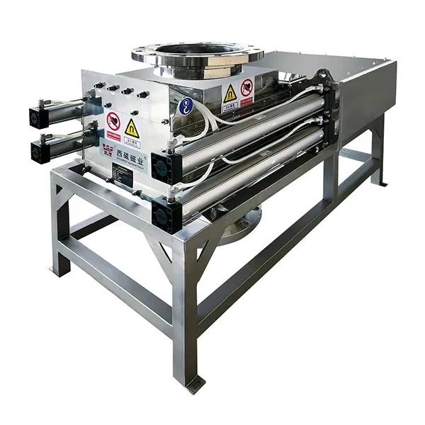 - A vibration-assisted design enhances material detachment from the magnetic rods. The dual-support structure ensures mechanical stability, preventing stress-related component failures. Before each cleaning cycle, the vibration system loosens accumulated material, reducing raw material loss. Once ferrous impurities remain attached to the rods, the scraper assembly automatically removes them. A second vibration cycle at the end ensures complete impurity removal from the magnetic rod ends.