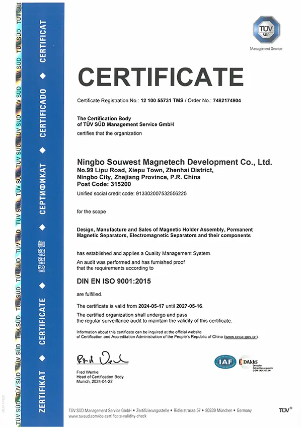 Ningbo Souwest Magnetech Development Co., Ltd. (Stock Code: 836961) was established in 2003 and, in December 2023, became the first publicly listed company in China's fine particle magnetic separation industry on the Beijing Stock Exchange. With a strong foundation in magnetic technology research, design, and manufacturing, we provide solutions for a wide range of industries, ensuring effective removal of ferromagnetic contaminants from materials across various processing environments.